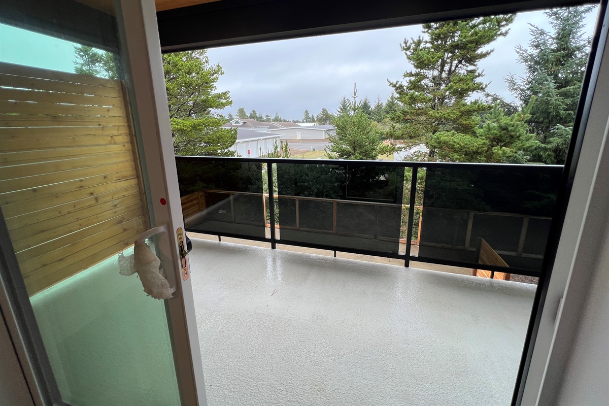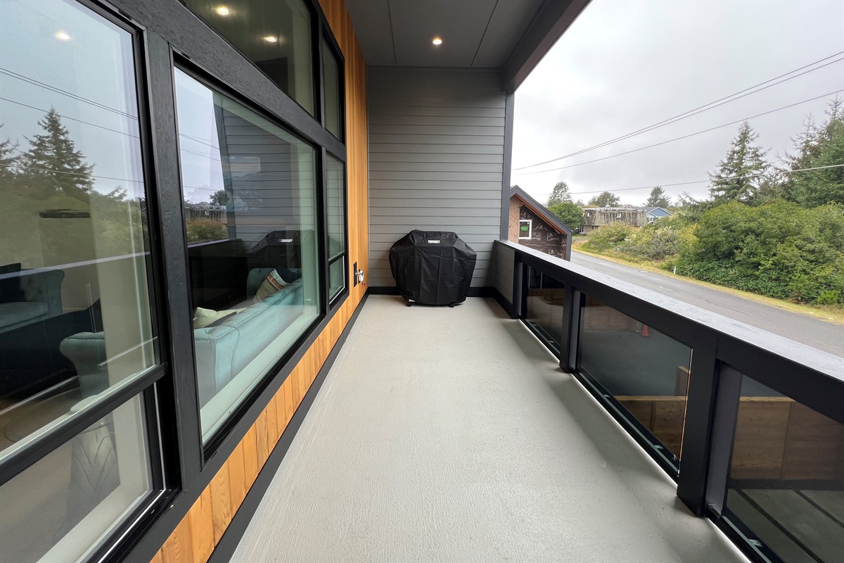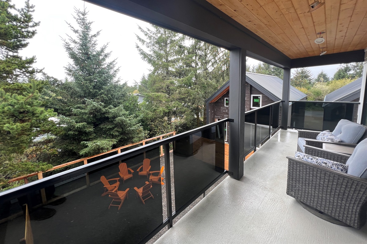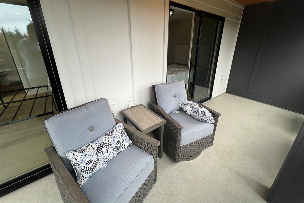 Upstairs primary suite with queen bed, ensuite shower, private walkout patio with glass railing and seating, and in-room coffee maker