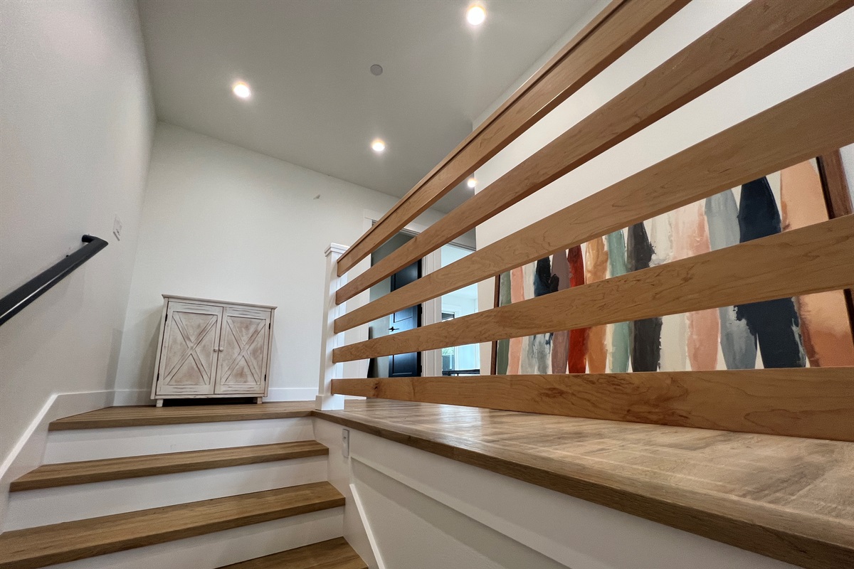The two homes are connected by a private interior door upstairs only. There is no exterior or downstairs connection. Each side functions as a complete home while still allowing easy movement between spaces.